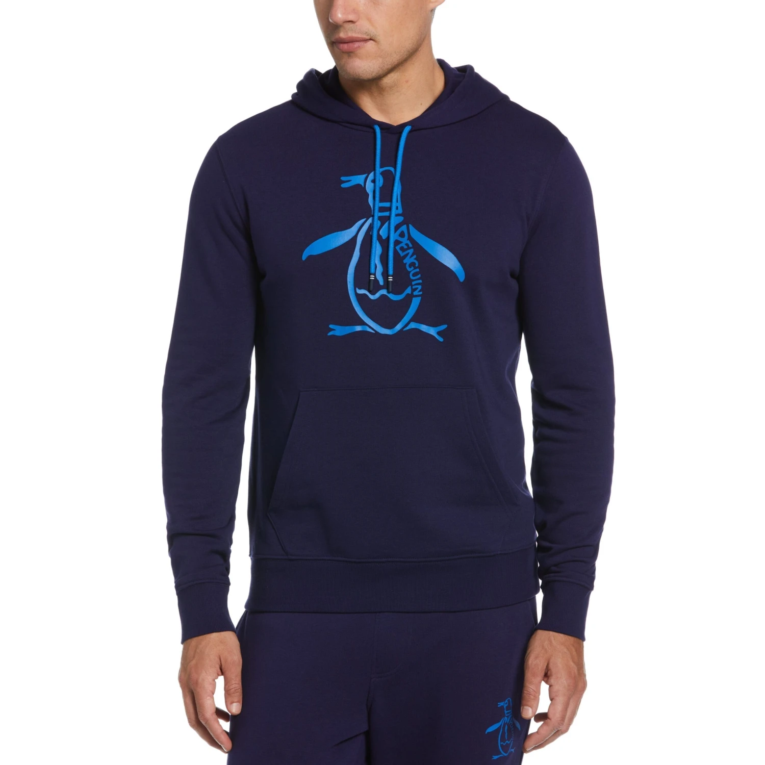 Featuring a big Pete graphic on the front, this Original Penguin men’s hoodie will bring both cool vibes and an extra layer of warmth to your casual wardrobe. It’s crafted from lightweight fleece, made from an organic cotton blend for softness and breathability. A practical kangaroo pocket at the front helps to protect your hands on windy days, while the drawstring hood and ribbed hem and cuffs help to customize the fit.