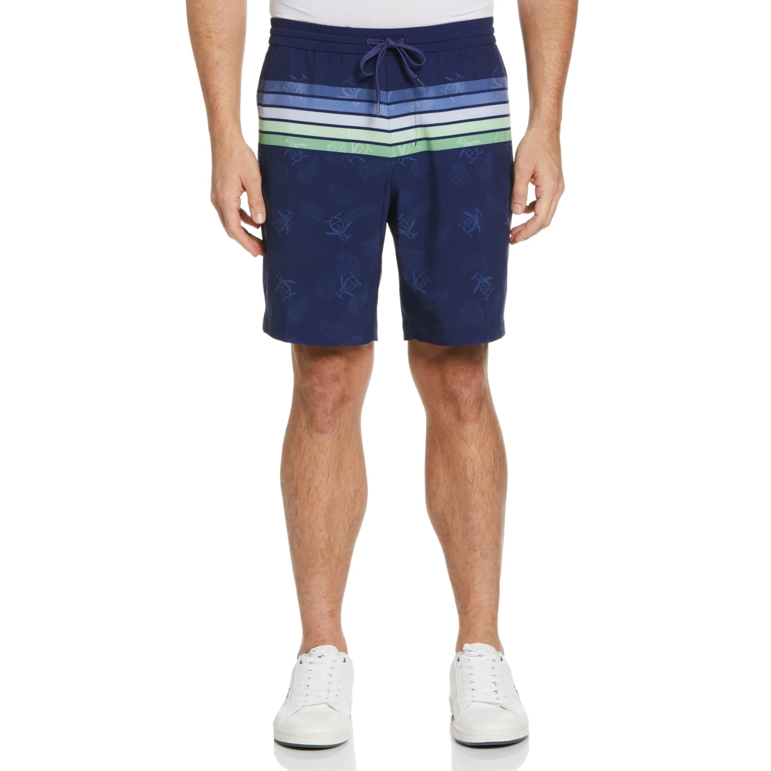 Enjoy lightweight, quick-drying comfort in these versatile boardshorts from Original Penguin. The durable plain weave fabric is water resistant and moisture wicking to help keep you feeling your best in or out of the water. Featuring four-way stretch and a covered elastic drawstring waistband, these shorts allow for flexible all-day comfort. The engineered striped print is eye-catching yet versatile, and features recycled polyester.