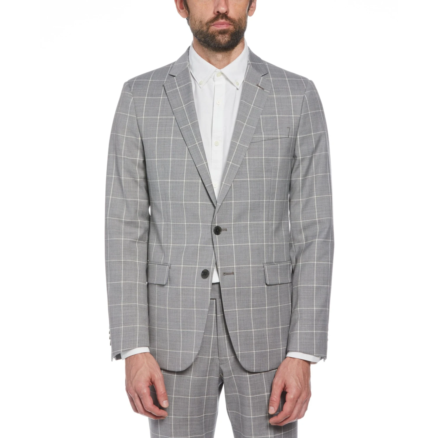 Show off your style with this classic windowpane plaid-printed men’s two-piece suit from Original Penguin. Made from a soft, moisture wicking wool blend jersey fabric, this suit jacket and pant set is perfect for any formal occasion. The jacket is two-buttoned, with notched lapels, a fully lined interior, straight flap pockets, and a welt chest pocket. Four interior pockets keep your essentials secure as you move through your day. The suit pants feature a comfortable stretch waistband, with a hook and bar with button closure and a zipper fly. Two front pockets add even more convenient on-the-go storage. The two-piece suit comes in a light grey color that complements almost any tone with ease.