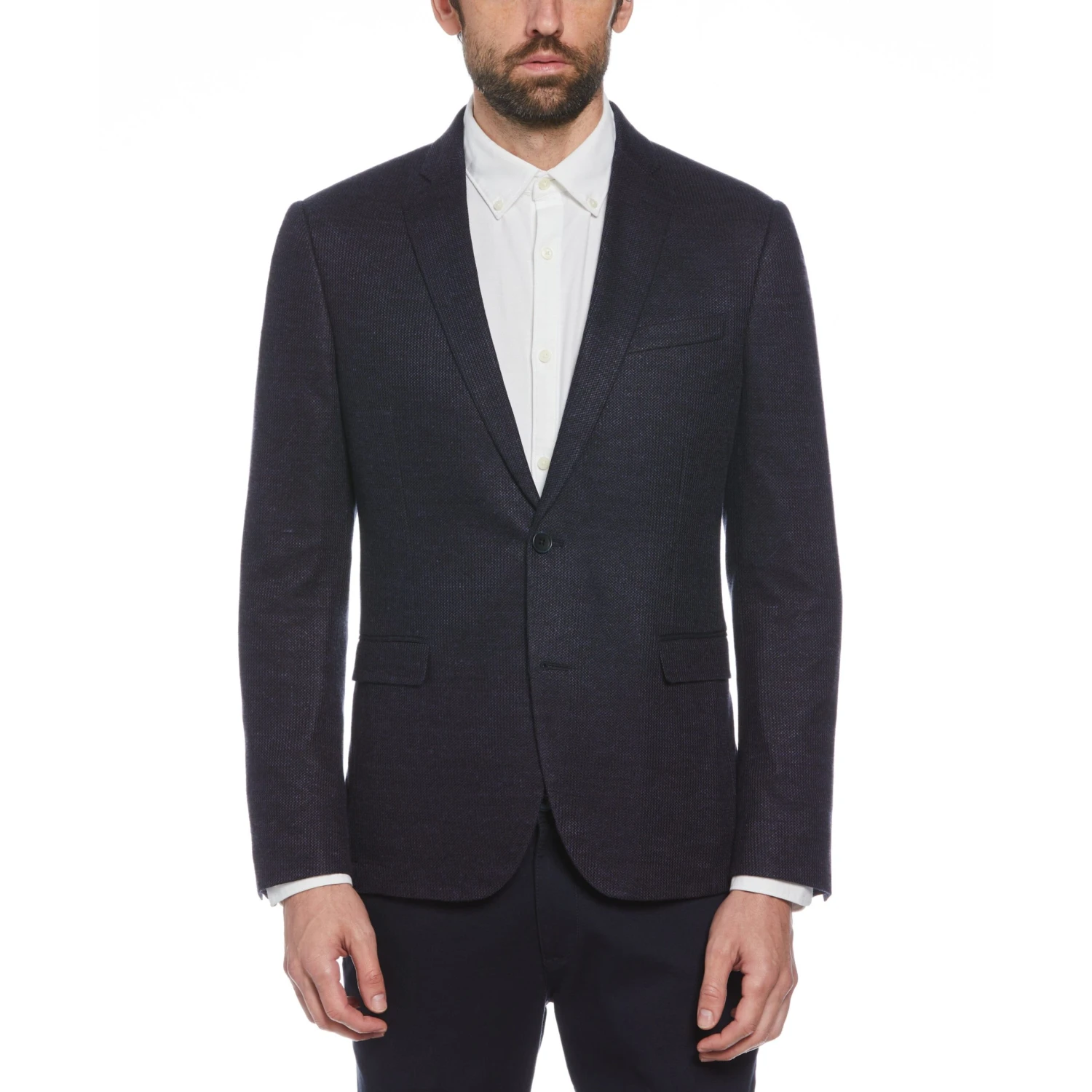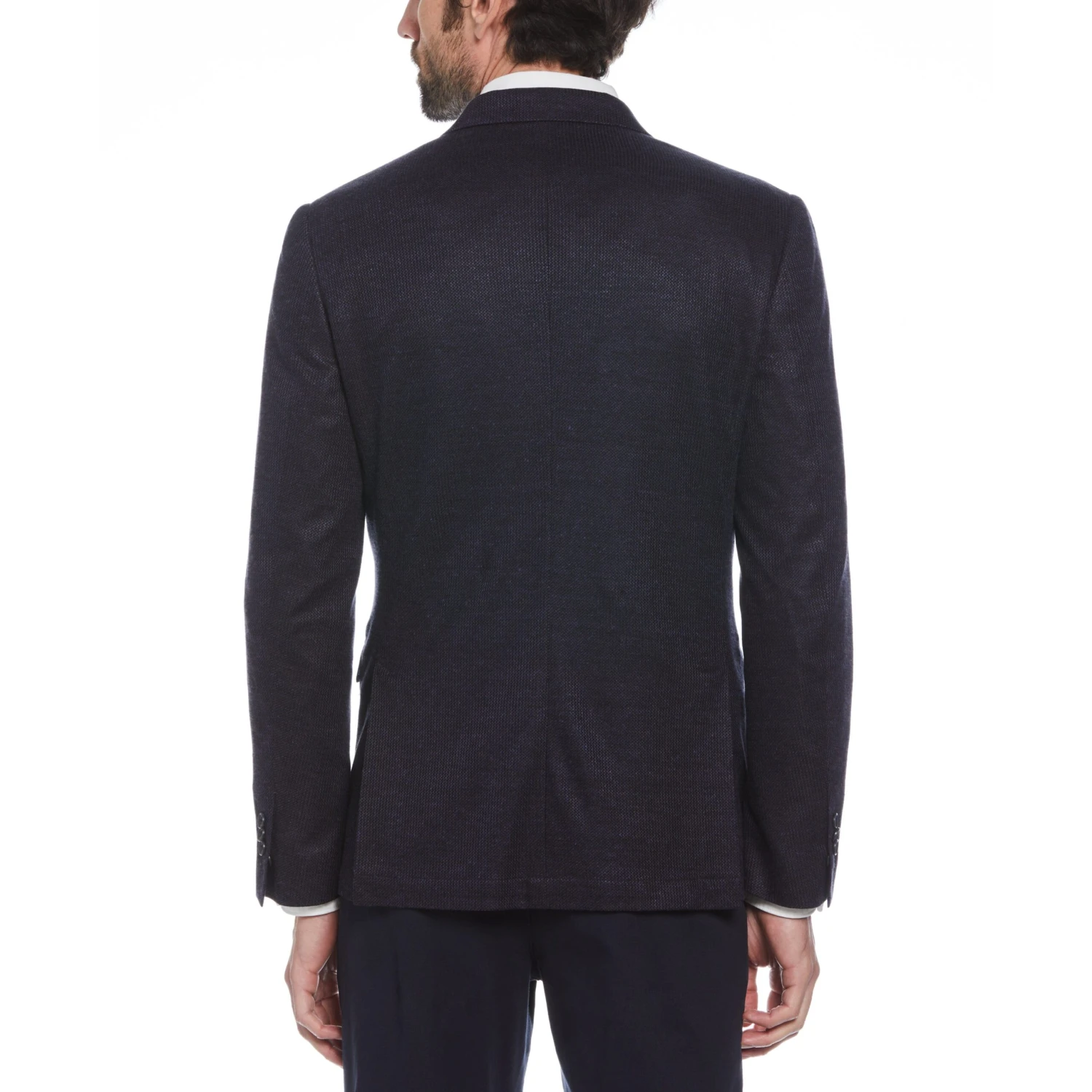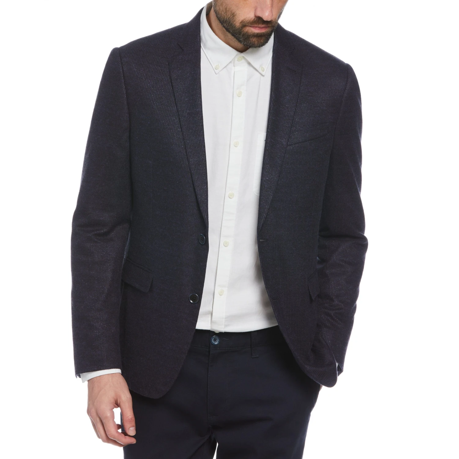 Featuring soft and lightweight jersey fabric, this solid-colored men’s blazer jacket from Original Penguin will be a practical and stylish addition to your wardrobe. The material is made from a blend of breathable linen and moisture wicking wool, with performance stretch to help allow for a full range of motion. The sleek design features a two-button closure, notched lapels, two angled flap pockets and one welt chest pocket. Two interior pockets add convenient extra storage for small items, while a quarter butterfly lining helps to keep the sport coat comfortable to wear throughout your busy day. Available in a versatile navy color, the slim fit suit jacket is designed to provide a polished and sophisticated look.