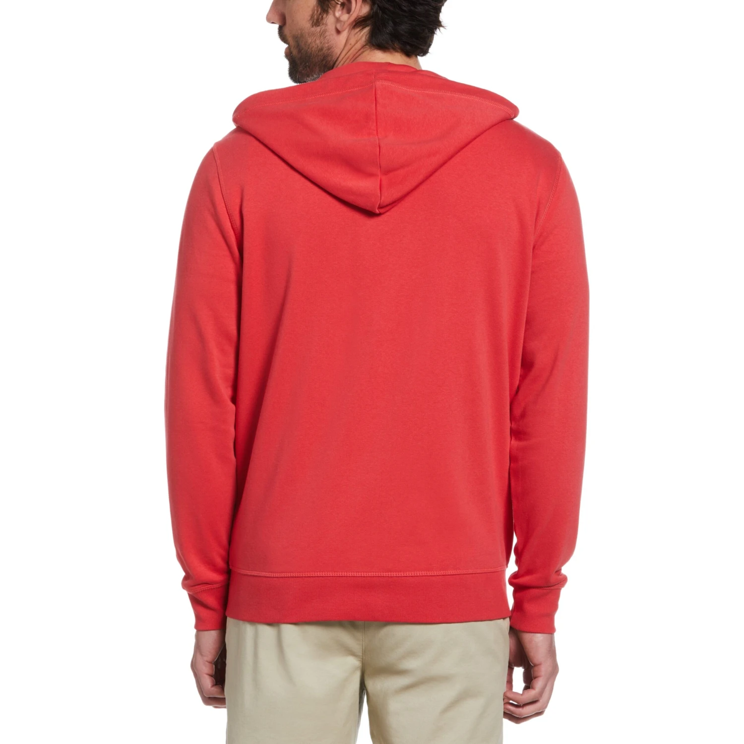 Add both cool style and lightweight warmth to your wardrobe with this versatile solid-colored men’s hoodie from Original Penguin. The men’s hooded sweatshirt is made from soft fleece, with large pockets at the front to help protect your hands from the elements. The hood has a drawcord to help keep it in place on windy days, while a full zip closure makes it a breeze to get on and off. A sticker-inspired version of our mascot Pete appears on the chest, giving the laidback design his stamp of approval.