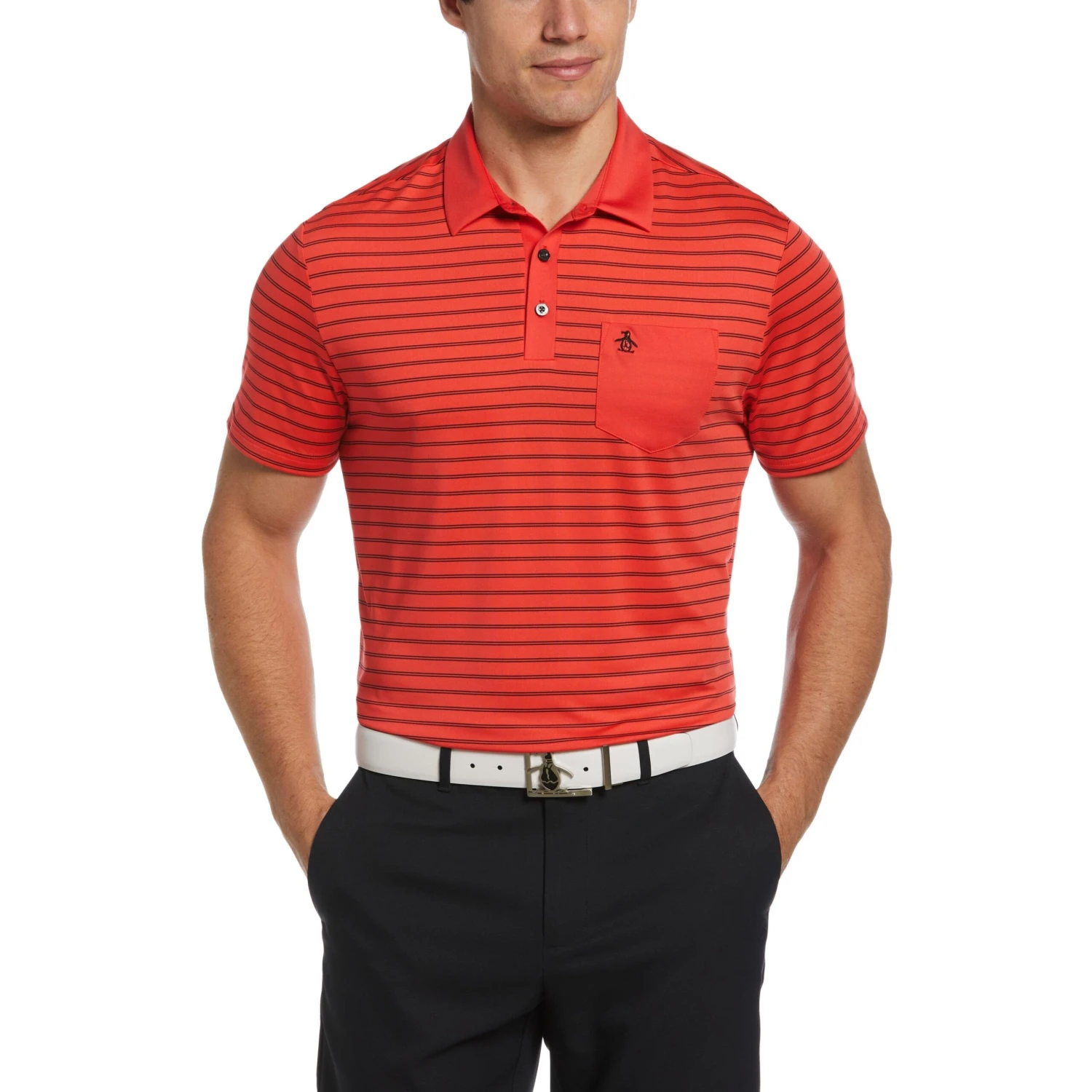 This men’s golf shirt from Original Penguin has you covered for golfing or for whatever you get up to throughout the day. The versatile two-color striped print pairs easily with a wide range of bottoms and the solid collar, placket and chest pocket add some subtle focal points. This short sleeve golf polo is crafted with jersey fabrication for a soft feel and features a self polo collar with three-button placket for custom styling options and easy on and off.