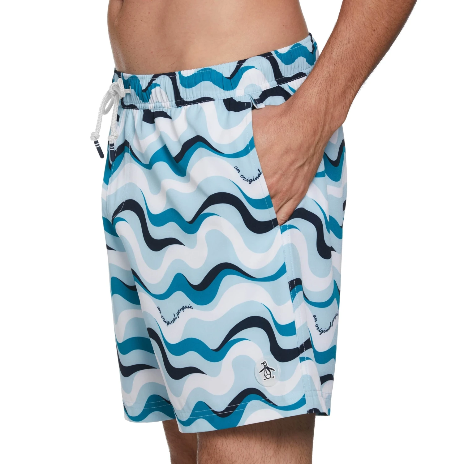 These eco-friendly men’s swim shorts from Original Penguin are designed to combine style and sustainability in one sleek package. Crafted from 55% recycled polyester sourced from plastic bottles, these swimming trunks are the perfect beach companion for eco-conscious swimmers. Lightweight twill fabrication ensures a comfortable fit, while the stylish wave print guarantees you’ll make a splash at the pool or beach. Embrace the perfect balance of fashion and function with these men’s swim trunks, expertly tailored to suit your swimwear needs. Dive into a greener future with Original Penguin’s sustainable men’s swimwear.